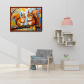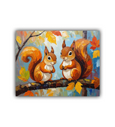This lively wall art captures the warmth and charm of two playful squirrels nestled on a tree branch amidst a vibrant autumn backdrop. Painted with rich, warm hues of orange, yellow, and blue, the piece evokes the cozy feeling of fall while celebrating friendship and nature. Perfect for adding a cheerful and inviting touch to modern living spaces, this artwork brings the beauty and whimsy of the forest indoors.