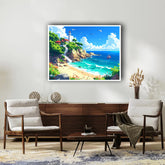 Capture the tranquility of the seaside with this Beach Lighthouse Coastal Wall Art. The painting depicts a charming lighthouse perched on rocky cliffs, overlooking turquoise waves and a sandy shore under a bright blue sky, while a boat sails by and seagulls soar overhead. Perfect for living rooms, bedrooms, cafes, or offices, this artwork evokes feelings of calm, inspiration, and coastal beauty. Bring a refreshing, nautical touch to your décor with this peaceful and vibrant beach landscape, available at WallArtVibes.com.