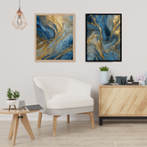 Elevate your space with this breathtaking blue and gold fluid art diptych featuring flowing marble patterns and luxurious metallic accents that create a sophisticated focal point. This premium canvas set captures the organic beauty of natural geodes through contemporary abstract fluid techniques in rich sapphire blues and shimmering gold veins.