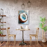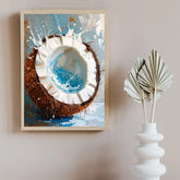 Add a tropical touch to your space with this dynamic coconut water splash wall art featuring a cracked coconut with refreshing blue water against an artistic splattered background. This vibrant painting captures the essence of fresh coconut water with realistic textures and energetic splash effects.