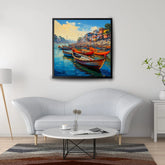 This stunning artwork showcases a fleet of brightly painted rowboats bobbing gently on vivid blue waters, set against the iconic backdrop of riverside ghats and houses under a brilliant morning sky. The interplay of colors, reflections, and lively scenery captures the vibrant rhythm of life along the riverbanks. Perfect for adding energy and charm to living rooms, offices, or entryways, this piece brings the essence of travel, culture, and riverside harmony into contemporary decor.