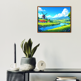Escape to the peaceful countryside with this enchanting windmill landscape painting featuring rolling green meadows, a winding river, and fluffy white clouds against brilliant blue skies. This premium nature canvas captures the timeless beauty of rural life with vibrant colors that bring outdoor tranquility indoors.