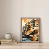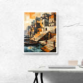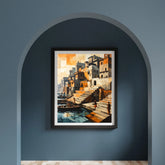 This contemporary artwork reimagines traditional riverside ghats in a striking cubist style, with geometric blocks of orange, beige, and grey forming clustered buildings and steep steps descending to calm water. Boats and figures add a sense of lived-in warmth and daily routine, while fragmented light creates a vibrant, artistic energy. Displayed on a simple wooden shelf beside classic books and ceramics, this print is perfect for modern spaces seeking a blend of tradition, creativity, and architectural intrigue.