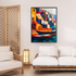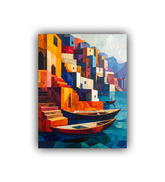 This visually dynamic artwork transforms a riverside scene into a cubist mosaic of vivid color blocks—fiery oranges and yellows for sunlit steps and facades, cool blues and violets for clustered houses, and deep teal for rippling water. Angular boats rest at the shore, echoing the geometric forms of the hillside village above, while reflections add depth and intrigue. Perfect for contemporary spaces or creative studios, this print brings modern energy, playful abstraction, and a sense of vibrant place to any interior.