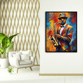 A vibrant celebration of music and movement, this painting captures the intimate moment between saxophonist and sound, with energetic splashes of color that evoke the joy and complexity of jazz improvisation.
