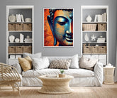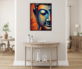 This imaginative digital artwork offers a striking juxtaposition between spiritual serenity and fiery dynamism. The partial Buddha figure emerges from cascading waves of molten orange and crimson, its stylized turquoise hair adorned with spiral patterns resonating like cosmic galaxies. Intense, swirling background motifs evoke the interplay of chaos and peace—reflecting the transformation of turmoil into tranquility through meditative focus. The bold use of cool blue against warm, swirling reds portrays a visual balance of opposites, embodying wisdom, compassion, and the transcendence of worldly suffering. Every detail, from the reflective ear to the hypnotic curls, creates a sense of awakening, inviting observers into a narrative of inner illumination and transcendent grace.