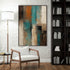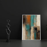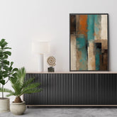 This abstract painting is a compelling interplay of geometric forms, textured layers, and earthy color fields. Its surface conveys a sense of age and urban decay, punctuated by vivid turquoise and warm burnt orange. The palette and tactile intensity invite viewers to contemplate the passage of time and unravel stories embedded in urban landscapes.