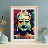 The geometric faceted style transforms traditional Buddha imagery into a modern masterpiece using rich jewel tones of teal, orange, purple, and gold. Perfect for contemporary spiritual spaces and modern homes that appreciate the intersection of ancient philosophy and modern aesthetics.