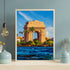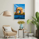 Striking painting of a majestic monumental arch (like India Gate) rendered in rich gold tones, dramatically juxtaposed with thick, contrasting deep blue water and a sunny sky. A powerful and vivid statement piece.