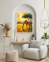 Bathed in soft sunlight, this artwork beautifully portrays a tranquil giraffe as it grazes beneath the vast, golden sky of the African plains. Vibrant brushstrokes and warm colors evoke the serene majesty of a sunrise on the savannah, bringing a sense of peace, connection to nature, and uplifting energy to any home or office.
