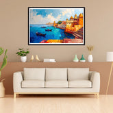 Discover the spiritual essence of India with this magnificent sacred river ghats canvas painting. Featuring traditional stepped platforms along holy waters, complete with devotional boats and ancient temple architecture, this artwork captures the timeless beauty and cultural significance of India's most revered riverside sanctuaries.