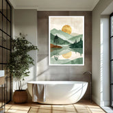 This wall art showcases a minimalist mountain landscape with a soft sunrise and soothing natural colors. The calm and balanced composition adds a peaceful atmosphere to modern interiors.