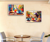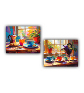 This vibrant kitchen scene features a colorful painting above the sink, depicting a cheerful breakfast tableau. The artwork showcases a steaming blue coffee cup and a bright orange mug, surrounded by cookie-topped saucers, a metallic coffee maker, and a potted plant basking in sunlight near a window. The energetic brushwork and saturated hues create a cozy, inviting atmosphere filled with warmth and the simple pleasure of morning light. Shadows fall playfully across the mint-green walls and wooden countertops, complemented by fresh flowers in a white jug and minimalist ceramic containers, blending art and life into a serene domestic setting.