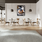 This mouthwatering artwork features a delicious stack of golden pancakes topped with fresh blueberries, drizzled with berry compote and cream, and surrounded by breakfast table elements. The vivid details and inviting composition bring warmth, comfort, and a touch of gourmet style to dining spaces or kitchens—perfect for anyone who enjoys the cozy rituals of a leisurely breakfast or brunch.
