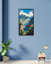 Embark on a visual adventure with this vibrant mountain valley landscape illustration featuring dramatic mountain ranges, winding paths through valleys, crystal-clear lakes, and lush green forests rendered in a modern travel poster style with bold, saturated colors. This premium adventure canvas captures the spirit of outdoor exploration with its stylized illustration technique that evokes classic national park posters.