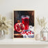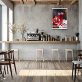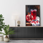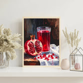 Elevate your kitchen with this elegant pomegranate juice still life painting featuring a realistic glass of ruby-red juice alongside fresh pomegranate halves and scattered seeds on a rustic wooden surface. This sophisticated artwork combines rich burgundy tones with dramatic lighting against a moody background.