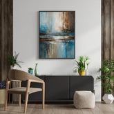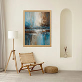 This abstract painting evokes the serene merging of earth and sky, blending soft azure blues and earthy browns with diffused streaks and layered flows. The composition suggests a tranquil lakeside scene, with gentle vertical drips and a central horizontal axis generating the illusion of mirrored water reflection. The interplay of light and muted color washes invites contemplation of nature’s subtle transitions, offering a calming sense of depth and peaceful introspection.