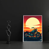 apture the spirit of freedom and adventure with this stunning vintage motorcycle sunset canvas art. Featuring a classic motorcycle silhouetted against a magnificent golden sunset with layered orange, red, and yellow hues, this retro-inspired piece evokes the timeless appeal of the open road and endless possibilities.