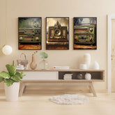 Celebrate the timeless beauty of vintage audio with this striking wall art trio. Featuring two classic radios and an antique gramophone, each illustration pops against the subtle, minimalistic living room setting. The muted green and wood tones evoke an era of analog charm and musical nostalgia, while the modern framing and pastel decor create a fresh, harmonious blend of old and new. Perfect for music lovers, retro enthusiasts, or anyone seeking a cozy atmosphere, this collection brings the spirit of classic sound into contemporary home design.