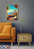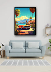 A fun, vibrant painting capturing the glamorous, sun-drenched feel of a Mediterranean or California coastal drive. An iconic orange convertible is parked near the beach, framed by swaying palm trees and distant hills. The bold color palette and warm light evoke a feeling of freedom, vacation, and vintage style, perfect for adding a touch of retro-coastal flair to your decor.