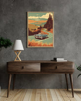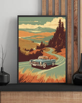 This retro-inspired art piece evokes a sense of freedom and nostalgia, featuring a classic convertible weaving through sunlit hills toward the distant mountains. Its warm, subdued color palette and crisp lines make it ideal for lovers of vintage travel and scenic escape.