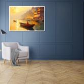 Experience the divine beauty of Varanasi at golden hour with this stunning sunrise ghat painting featuring the sacred Ganges River bathed in warm morning light, with traditional boats, ancient temple architecture, and devotees gathering for morning rituals. This premium spiritual canvas captures the mystical atmosphere of India's holiest city where every sunrise brings renewal and spiritual awakening.