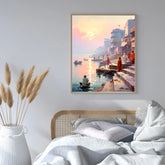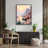 Experience the spiritual and serene beauty of a sunrise along the ghats with this captivating artwork. Warm, diffused sunlight bathes the riverfront, where people in vivid robes ascend and descend the stone steps, their reflections shimmering in tranquil waters. Boats float quietly in the distance, all beneath a pastel sky that conveys peace and hope. This piece is ideal for meditation corners, living areas, or spaces devoted to mindfulness and culture, inviting calm and inspiration through its harmonious depiction of daily ritual and riverside life.