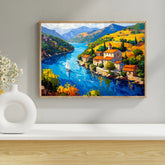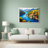 Be transported to a sun-kissed European coastline with this vibrant and richly colored painting. A secluded coastal village with terracotta-roofed houses is nestled on rolling hillsides painted in bright golds and greens. Below, a small sailboat glides across the striking, deep azure blue waters of the inlet, which beautifully reflect the surrounding landscape. The artwork is rendered with thick, textured brushwork that emphasizes the bright, warm light and the rich tones of the Mediterranean. It's an ideal piece for bringing a feeling of vacation tranquility and bold color into your living space.