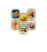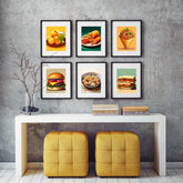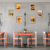 Transform any room into a celebration of global flavors with this distinctive food-themed art collection. The gallery showcases lively illustrations of popular street foods—spanning savory dumplings, iconic burgers, crisp spring rolls, mouthwatering sandwiches, vibrant salads, and Indian street snacks—arranged in a clean, modern layout against an industrial concrete wall. Each framed print radiates vivid colors and mouthwatering detail, creating a visually appetizing experience that invites conversation and nostalgia.