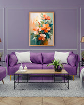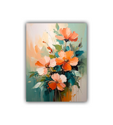 A bouquet of bold orange and peach flowers radiates warmth and vitality from every petal. The expressive brushstrokes and dynamic arrangement command attention and spark positivity, making this art piece ideal for energizing sitting rooms, studios, or dining areas with cheerful color and spirited charm.