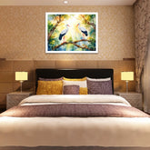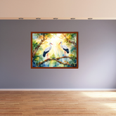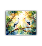 A peaceful depiction of two elegant white cranes perched gracefully on a sun-dappled branch, surrounded by vibrant greenery. The soft rays of sunlight filtering through the forest canopy create a calming, warm ambiance, making this artwork perfect for creating a tranquil and refreshing atmosphere in any space, especially reading nooks or restful corners.