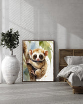 Meet this charming creature in a delicate watercolor style. Perched patiently on a branch, the animal—likely a Loris or similar small primate—captures the viewer's heart with its signature enormous, soulful eyes. The soft, diffused colors and gentle washes perfectly suit the subject, bringing a sense of warmth and innocence to the scene. This artwork adds a sweet, nature-inspired touch to any bedroom or nursery, celebrating the quieter wonders of the wild.