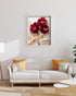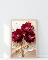 This elegant floral artwork captures the essence of deep romance. It showcases a trio of beautifully rendered flowers in a powerful ruby red, symbolizing love and desire. The composition is built on a sophisticated palette of cream, white, and subtle gold accents, giving the piece a delicate, refined, and feminine feel. The smooth, swirling textures in the background add graceful movement to this timelessly chic design.