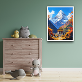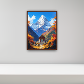 A vibrant and uplifting piece showcasing the dramatic clash of seasons and elements. The painting features the brilliant white and jagged edges of a snowy mountain set against the warm, rich tones of fall colors that line the valley. A rustic, ornate gate in the foreground adds a sense of human history and journey to the scene. Rendered with vivid detail and a dynamic palette, this artwork is perfect for adding a sense of adventure, aspiration, and bold natural beauty to your wall.