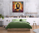 This spiritual canvas painting captures the essence of divine enlightenment through the serene facial expression and traditional artistic elements representing wisdom and inner peace. The golden tones symbolize spiritual awakening while the colorful background represents the journey toward enlightenment and consciousness expansion.