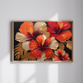Bring tropical paradise into your home with this magnificent hibiscus flowers painting featuring vibrant red and coral blooms with intricate petal details and golden pistils set against elegant bronze and gold tropical foliage on a dramatic dark background. This premium floral canvas captures the exotic beauty of tropical hibiscus flowers with stunning realism and rich color saturation.