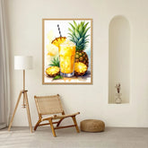 Transform your kitchen into a tropical paradise with this vibrant pineapple juice wall art featuring a tall glass of golden pineapple juice with fresh fruit slices and a striped straw against a sunny watercolor background. This bright artwork captures the essence of tropical freshness with realistic pineapple details and refreshing golden tones.