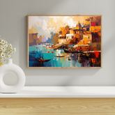 Immerse yourself in India's spiritual heart with this breathtaking Varanasi ghat painting featuring the sacred Ganges riverfront with traditional boats, ancient temples, and the iconic stepped architecture in warm golden and turquoise tones. This premium Indian heritage canvas captures the timeless beauty of Banaras where centuries of devotion and culture converge along the holy river.