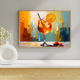 This colorful wall art piece features artistic elements including cocktail glass, orange slices, and cherries rendered in an impressionistic style. The warm color palette creates an inviting atmosphere perfect for entertaining spaces and adds a sophisticated touch to any modern interior.