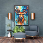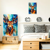 This dynamic wall art set features two powerful stags, rendered in expressive, watercolor-inspired brush strokes. Bursts of electric orange, royal blue, and emerald green create an energetic, modern vibe that amplifies the regal posture of each stag. Dramatic drips and splashes enliven the portraits, offering a bold focal point for living rooms, lounges, or creative offices. Symbolizing strength, grace, and natural beauty, these artworks are designed to awaken your space with their distinctive blend of wild spirit and contemporary style.