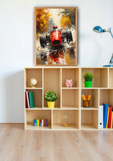 This dynamic artwork features a classic vintage racing car speeding through an autumn forest, splashing through leaves and water on a vibrant, tree-lined road. The bold red car, energetic brushstrokes, and brilliant fall colors capture the excitement and nostalgia of motorsport history. Perfect wall art for cafes, restaurants, garages, or any space wanting to showcase speed, adventure, and the timeless beauty of classic cars against a backdrop of colorful autumn foliage.