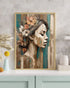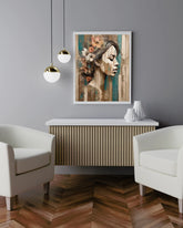 This captivating piece features the serene profile of a woman adorned with delicate flowers, blending natural beauty with a modern wood-textured backdrop. The harmonious mix of earthy browns, soft pastels, and turquoise accents creates an atmosphere of calm, introspection, and timeless elegance. "Whispering Blossoms" makes a perfect addition to tranquil, contemporary spaces, celebrating gentle strength and graceful femininity.