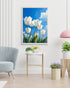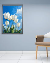 Transform your space with this breathtaking original canvas painting from our Floral Collection, featuring pristine white tulips blooming against a brilliant blue sky. This handcrafted artwork captures the elegant beauty of white tulips with their delicate petals and vibrant green stems, creating a perfect symbol of purity, new beginnings, and serenity.