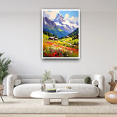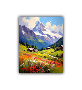 Step into a scene of pure, vibrant joy with this stunning oil painting of an alpine landscape. The foreground is a glorious carpet of wildflowers—red, yellow, purple, and pink—rendered with thick, enthusiastic brushstrokes that bring the texture of the meadow to life. Quaint wooden chalets are nestled on the rolling green hillside, leading the eye up toward the dramatic, white, snow-capped peak under a bright blue sky. This artwork is a celebration of summer in the mountains, perfect for adding a vivid splash of color and nature to any space.